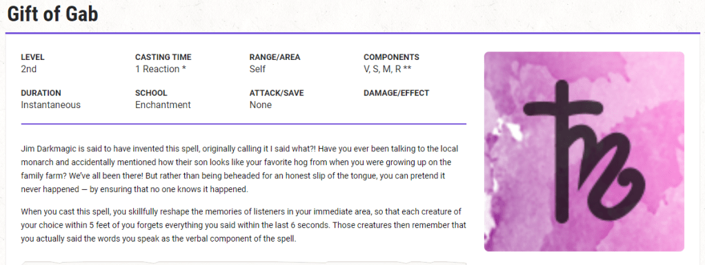 Assumption: Normal Spells are Spoken from Your Heart’s Fire In Disney Pixar’s Onward, Barley Lightfoot tells his brother that in order for a spell to work, it must be spoken confidently and with a richness and power to one’s voice. Barley calls this “speaking from your heart’s fire.” We’re going to assume that this is the requirement for spells with verbal components in Dungeons and Dragons, i.e., normal spells are spoken loudly and with gusto, drawing the attention of enemies in the same way shouting would.