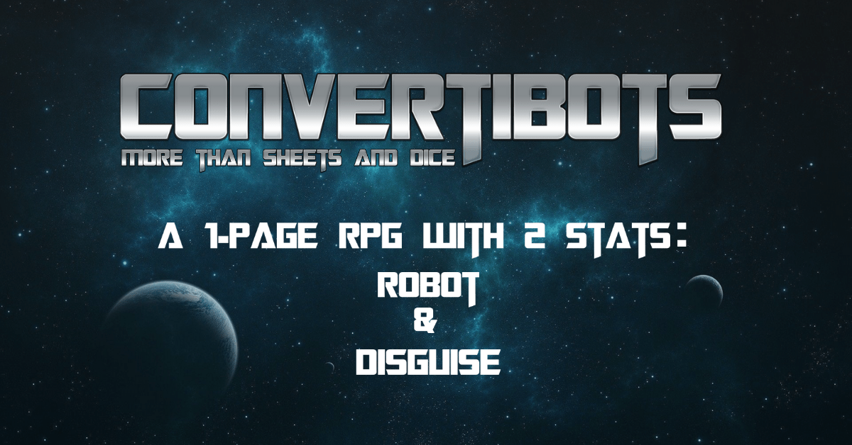 Convertibots is an action-packed, one-page RPG inspired by Grant Howitt’s Honey Heist. In Convertibots, you play a robot from a war-torn planet charged with protecting a human during all of their Important Activities, like going to coffee shops and taking part in #selfisunday. But beware! The evil Duplicicons are looking for the human. You must protect them.